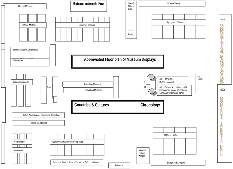 This museum is organized as a self-guided facility with numerous explanatory signs to help you along the path from earliest to modern state-of-the-art examples. An abbreviated floor plan of the displays is available at the sign-in desk. When possible, one of our student-helpers may provide answers to questions, but please respect their time is not at your disposal. If you would like to hear accordion music during your visit, please ask for the audio system to be turned on.